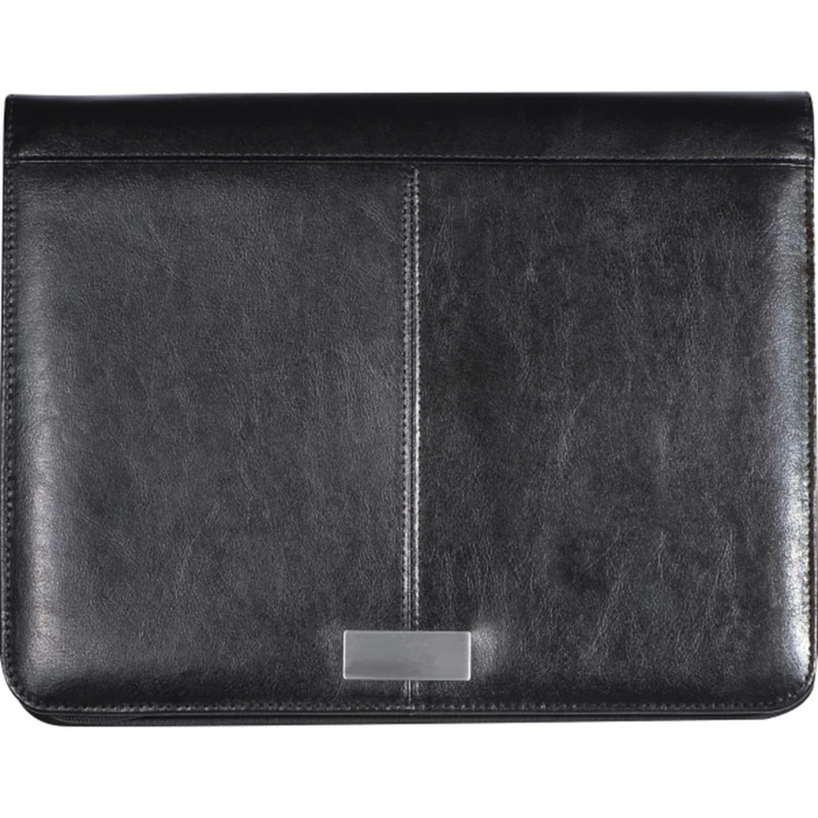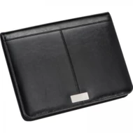 Folder A4 z materiału imitującego skórę. Posiada kieszeń na tablet, liczne przegródki, kieszeń i podstawkę pod telefon, miejsce na długopisy oraz notes w linie z małym kalendarzem.