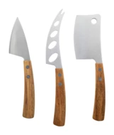 Zestaw 3 noży do sera ze stali nierdzewnej z rękojeściami z drewna akacjowego. W pudełku w kształcie książki z papieru kraft.