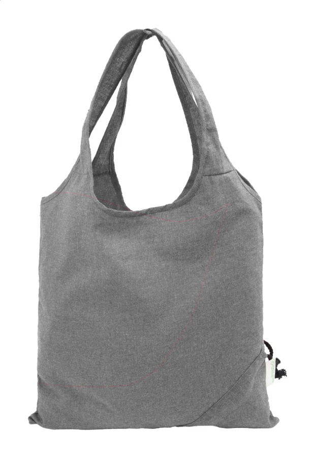 Składana torba na zakupy wykonana w 70% z bawełny pochodzącej z recyklingu i w 30% z poliestru RPET, o gramaturze 140 g/m². Z charakterystyczną metką z bawełny pochodzącej z recyklingu.