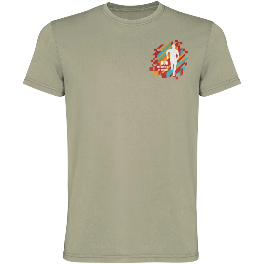 Męska koszulka z krótkim rękawem. Wykończenie uzyskane dzięki poddaniu działaniu wybielacza w celu uzyskania smug lub odbarwień. Okrągły dekolt wykończony prążkowanym ściągaczem 1x1. Ścieg kryty ton w ton z wykończeniem na wysoki połysk.