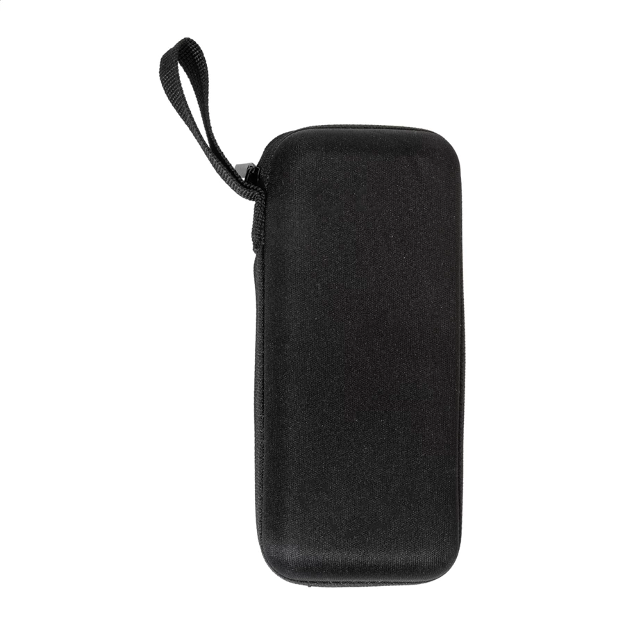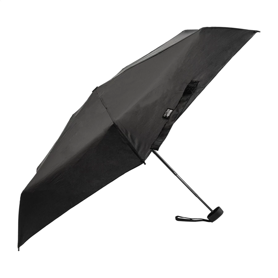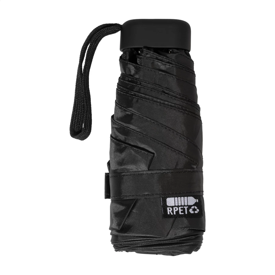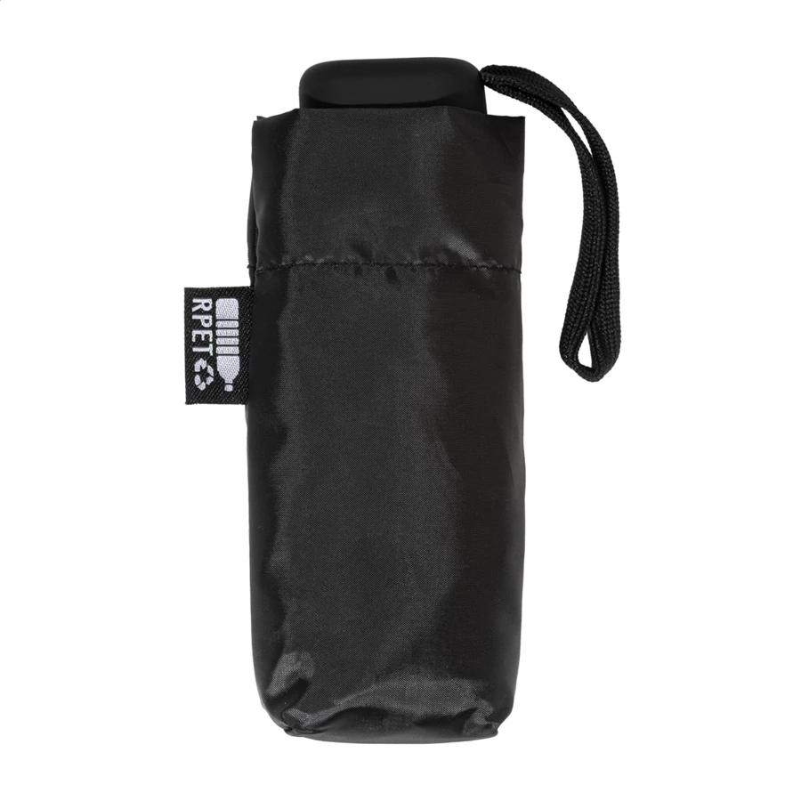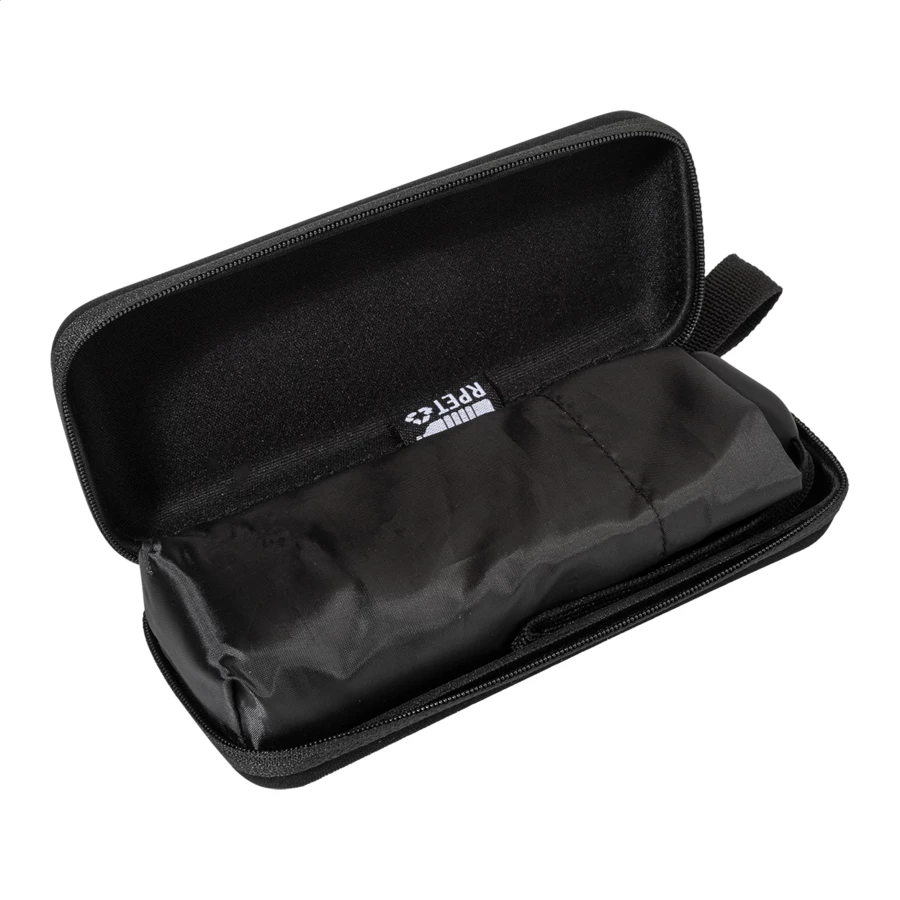 Ręczny, wiatroodporny, składany na 3 części mini parasol z 6 panelami, w pasującym kolorystycznie pokrowcu i zapinanym na zamek twardym etui EVA. Z metalową ramą, żebrami z włókna szklanego i kompaktową rączką z paskiem na rękę. Pongee 190T RPET, z charakterystyczną metką RPET.