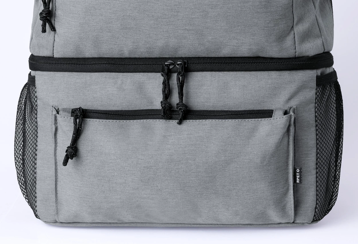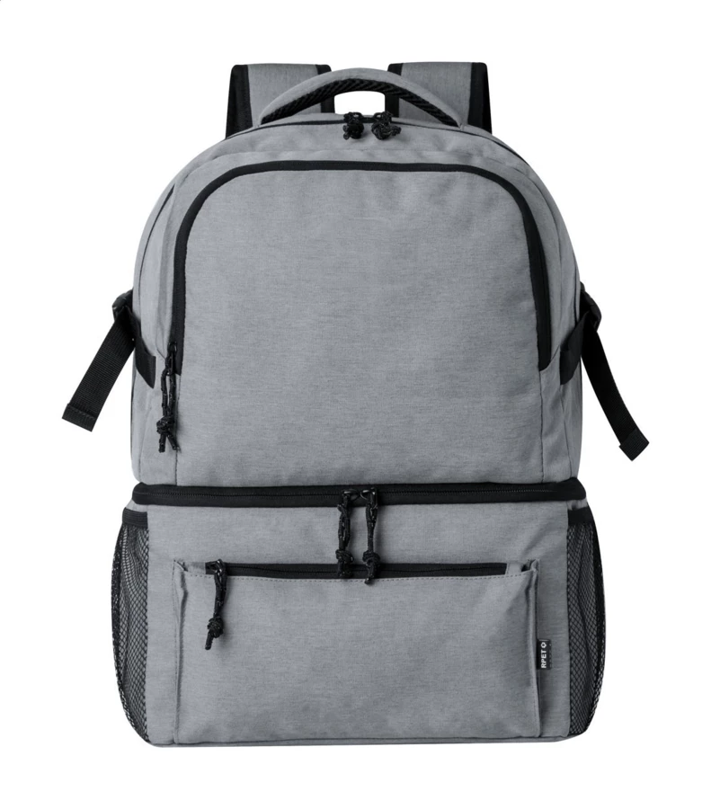 Plecak RPET z wyściełaną komorą termiczną PEVA, kieszeniami zapinanymi na zamek, bocznymi kieszeniami z siateczki, wyściełanymi plecami i szelkami. Poliester 600D RPET, z charakterystyczną metką RPET.