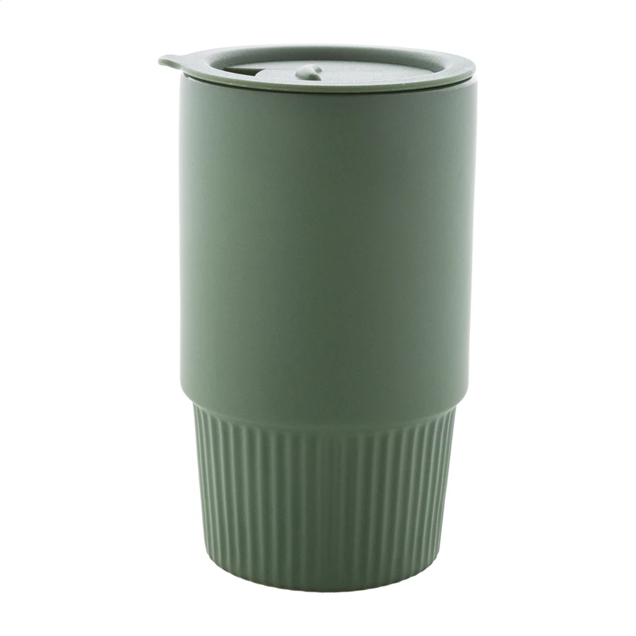 Wysokiej jakości ceramiczny kubek podróżny z matowym wykończeniem zewnętrznym i plastikową pokrywką PP. Pojemność 420 ml.