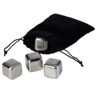 Zestaw 4 kostek lodu wielokrotnego użytku ze stali nierdzewnej w aksamitnym etui. Kostki te szybko i skutecznie schładzają napoje, zachowując jednocześnie ich smak.