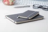 Teksturowany notes pokryty skórą PU z gumowym paskiem i 80 kartkami w linie. Rozmiar A6.