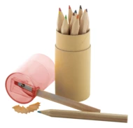 12szt kolorowych kredek w okrągłym, kartonowym pudełku z plastikową pokrywką/temperówką.