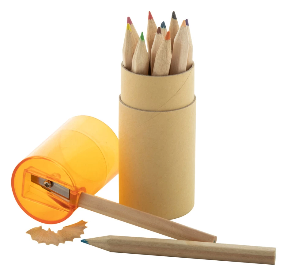 12szt kolorowych kredek w okrągłym, kartonowym pudełku z plastikową pokrywką/temperówką.