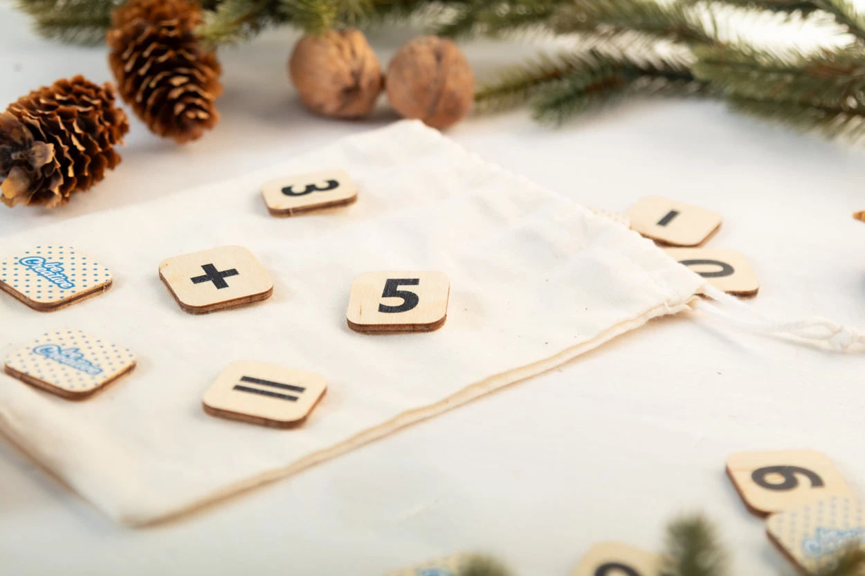 Personalizowna, edukacyjna gra w liczenie ze sklejki brzozowej, w bawełnianym etui. Zawiera 32 płytki, w tym cyfry i znaki operacji matematycznych. Cena obejmuje identyczny nadruk w pełnym kolorze na odwrocie wszystkich płytek. Min. Ilość: 100 szt.