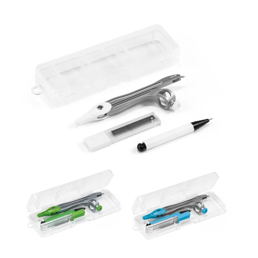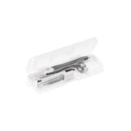 Szkolny zestaw do geometrii w etui z PP. Zawiera 1 cyrkiel, 1 ołówek automatyczny i 10 wkładów 0.5 mm. 128 x 42 x 20 mm