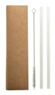 Zestaw 2 słomek wielokrotnego użytku ze szkła borokrzemianowego wraz ze szczotką do czyszczenia. W kartoniku.