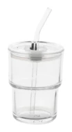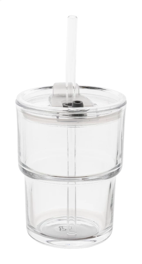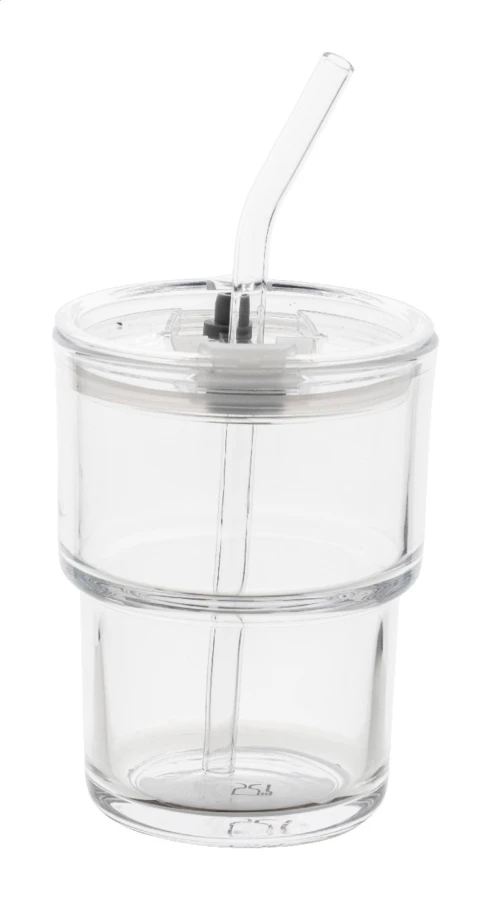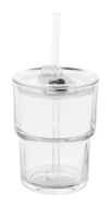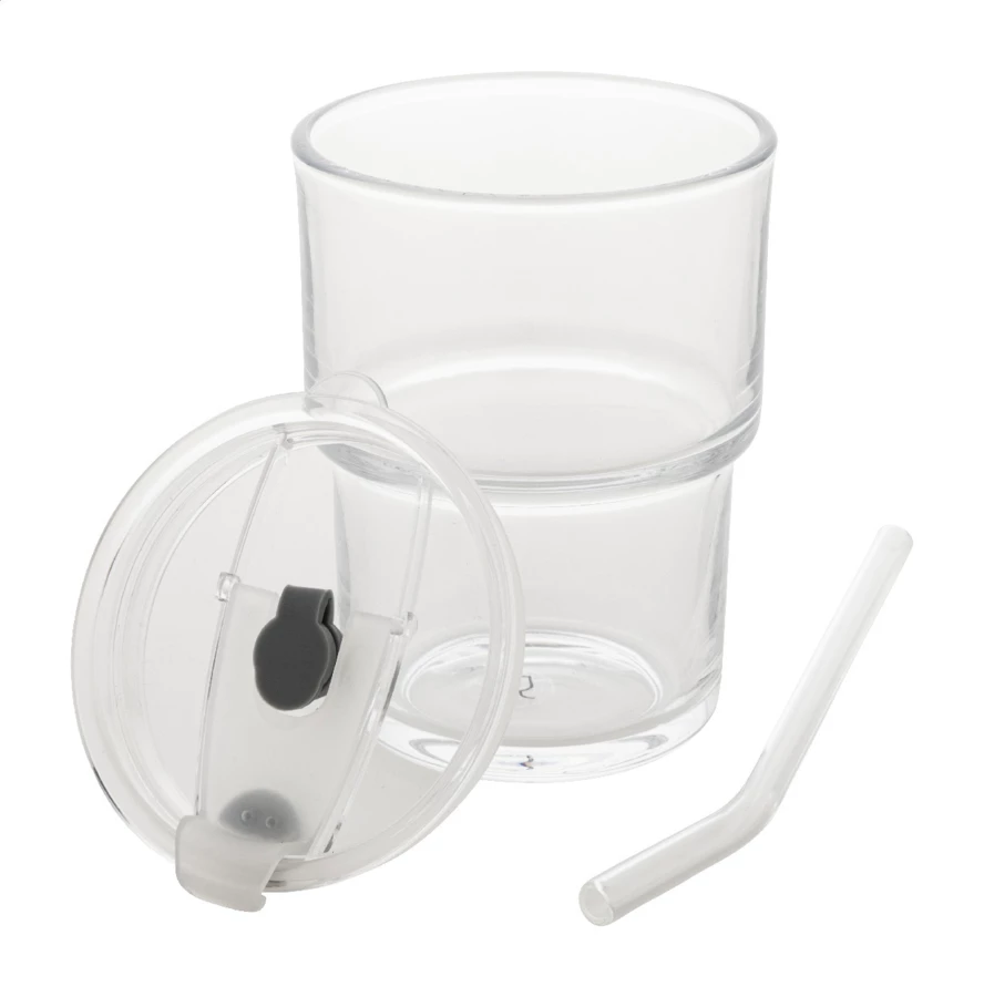 Szklany kubek podróżny z plastikową pokrywką i szklaną słomką. Pojemność 400 ml.