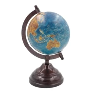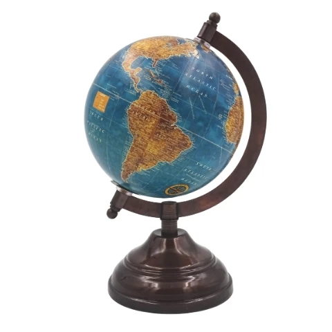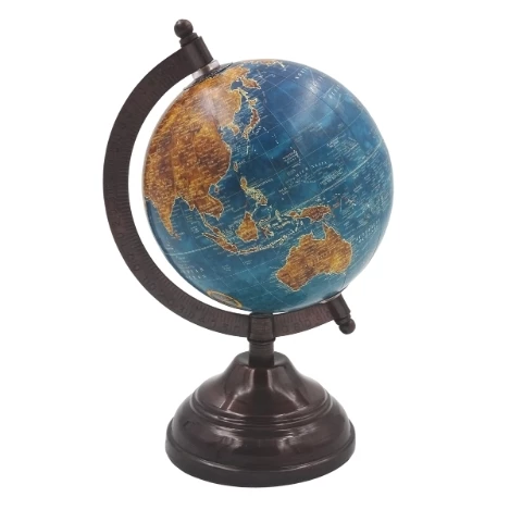 • Stylowy Design: Globus osadzony jest na metalowej podstawie, a jego mapa utrzymana jest w dominancie błękitu, brązów i żółci. Nazwy geograficzne są w języku angielskim.