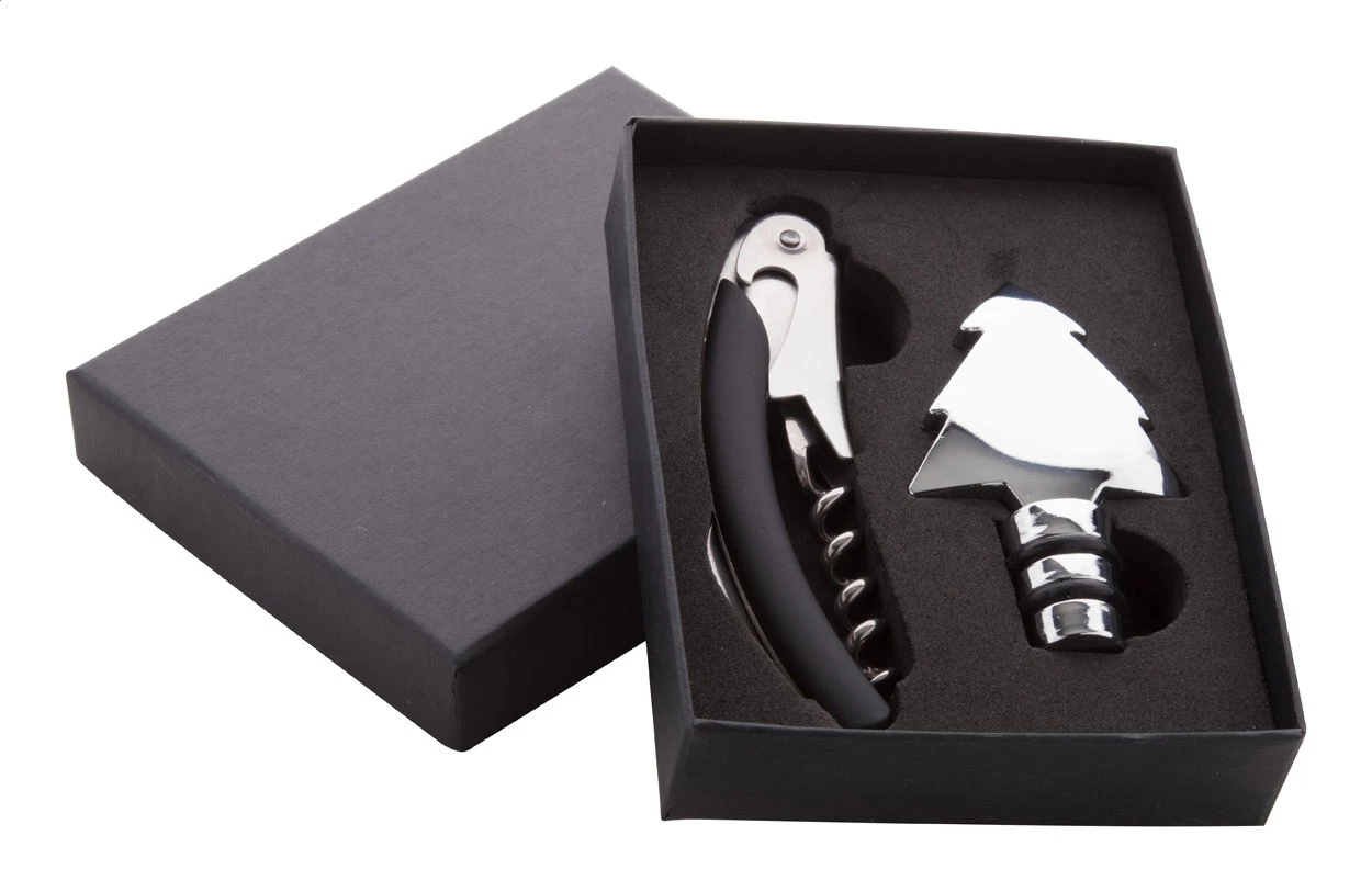 Zestaw do wina z korkociągiem i zatyczką do butelki w kształcie choinki. Zestaw w pudełku prezentowym.
