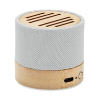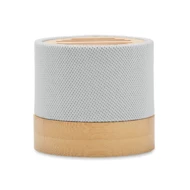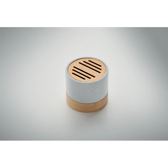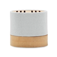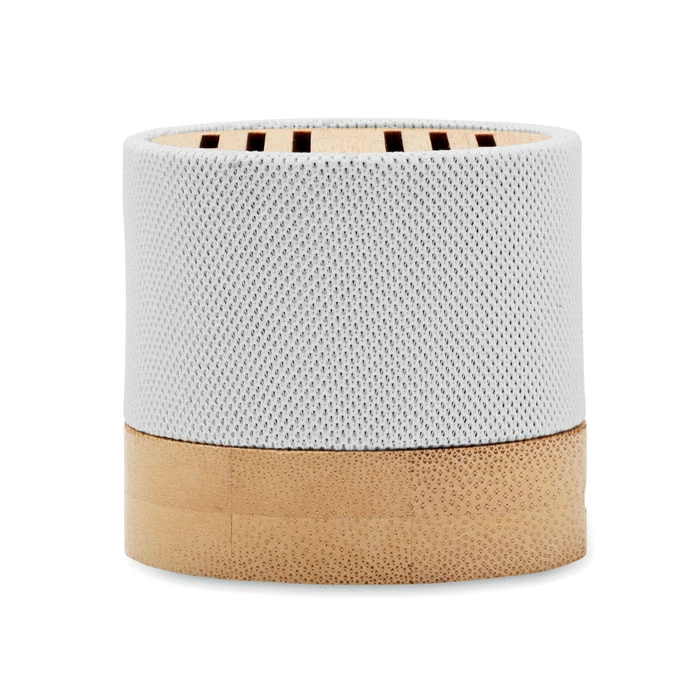 Głośnik bezprzewodowy 5.0 z RPET z bambusowym elementem. Sygnalizacja LED. 1 Akumulator Li-ION 300 mAh. Zawiera port kart SD oraz kabel AUX/USB. Wyjście: 3W, 3 Ohm i 5V. Czas odtwarzania ok. 3h. Bambus jest produktem naturalnym, dlatego mogą wystąpić nieznaczne różnice w kolorze, wzorze i rozmiarze.