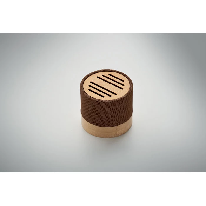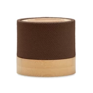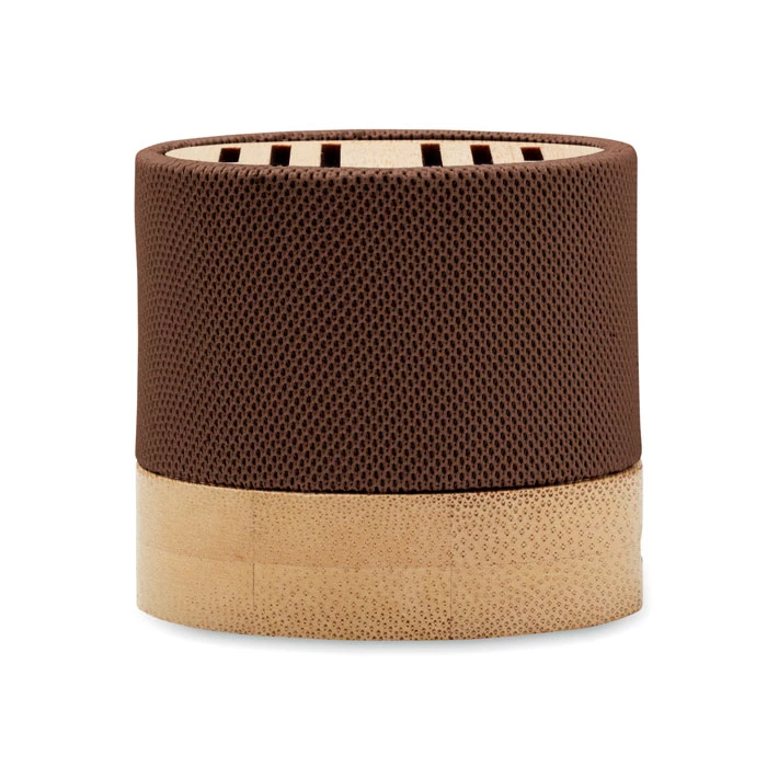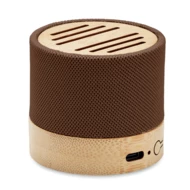Głośnik bezprzewodowy 5.0 z RPET z bambusowym elementem. Sygnalizacja LED. 1 Akumulator Li-ION 300 mAh. Zawiera port kart SD oraz kabel AUX/USB. Wyjście: 3W, 3 Ohm i 5V. Czas odtwarzania ok. 3h. Bambus jest produktem naturalnym, dlatego mogą wystąpić nieznaczne różnice w kolorze, wzorze i rozmiarze.