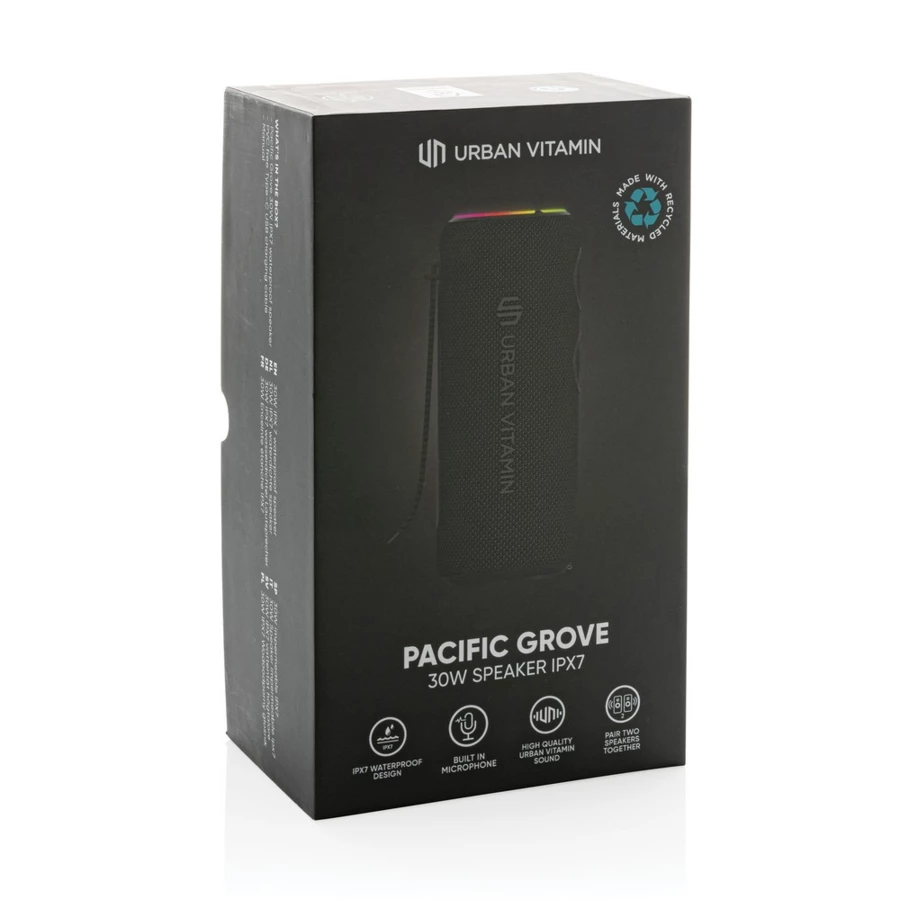 Głośnik bezprzewodowy 30 W, wodoodporny IPX7 (odporność do 1m na czas do 30 minut), uchwyt, 2 głośniki niskotonowe, możliwość sparowania dwóch głośników w celu uzyskania dźwięku stereo, do 8 godzin odtwarzania na jednym ładowaniu, wykonany z ABS i PET z recyklingu z certyfikatem RCS, całkowita zawartość materiałów obliczona na podstawie wagi całkowitej przedmiotu: 36%, ślad węglowy produktu: 0 kg CO2