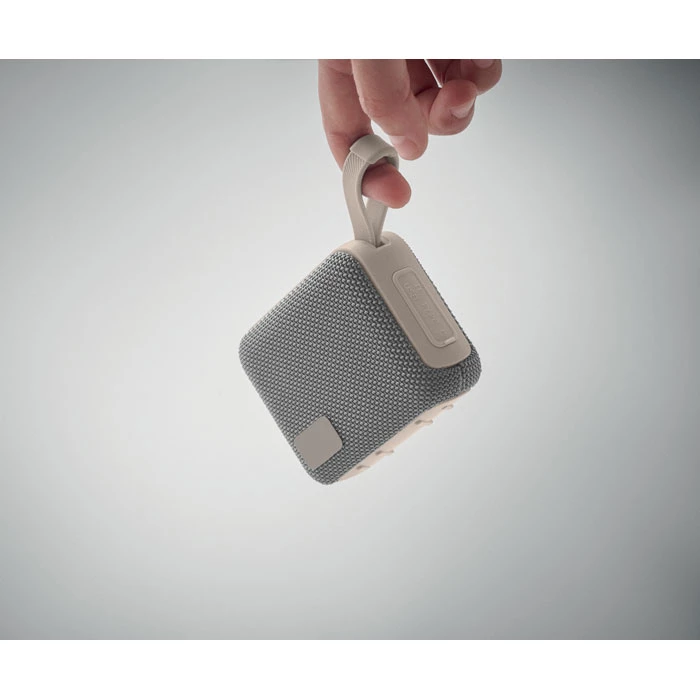 5.0 bezprzewodowy głośnik z ABS z tkaniną RPET i sznurkiem do zawieszania. 1 akumulator Li-ION 800 mAh w zestawie. Zawiera port karty SD i kabel AUX/USB. Dane wyjściowe: 5W, 3 Ohm i 5V. Czas odtwarzania ok. 3 godz
