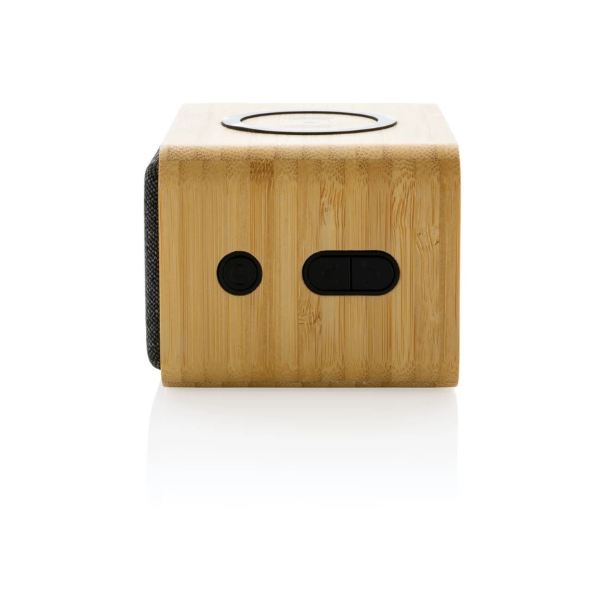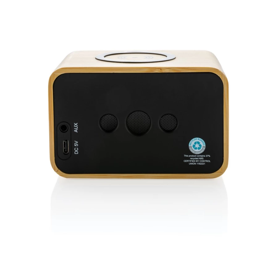 Głośnik bezprzewodowy 5W, BT 5.3, wykonany z naturalnego bambusa z certyfikatem FSC® oraz z ABS i PET z recyklingu z certyfikatem RCS, zawartość materiałów z recyklingu 51% obliczona na podstawie wagi całkowitej produktu, funkcja odbierania połączeń, wbudowany mikrofon, wbudowany akumulator o pojemności 1200 mAh umożliwia odtwarzanie muzyki do 6 godzin, kabel z TPE z recyklingu w komplecie, w kraftowym pudełku z certyfikatem FSC® mix, nie zawiera PVC, ślad węglowy produktu: 2,24 kg CO2