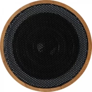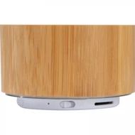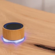 Głośnik Bluetooth z powłoką bambusową, podświetleniem od spodu, gniazdem na kartę i kablem do ładowania.