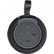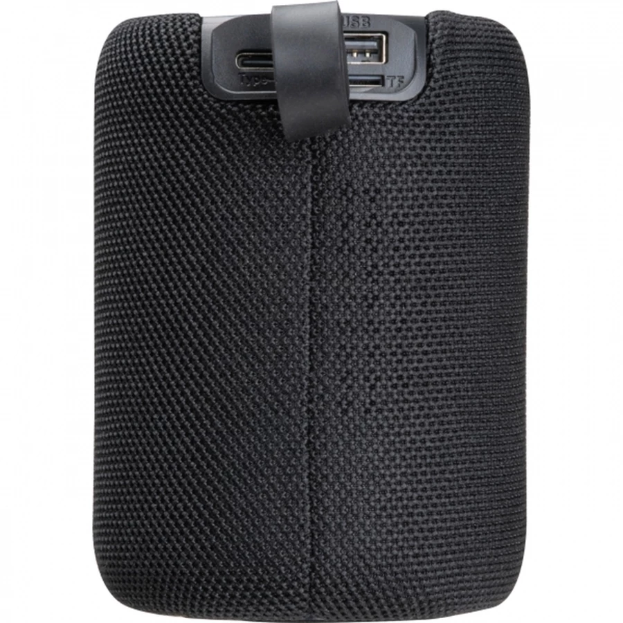 Okrągły, bezprzewodowy głośnik bluetooth, z baterią o pojemności 800 mAh (5V), diodami LED i kabelkiem do ładowania. Głośnik posiada złącze USB typu C, slot na kartę SD oraz mały uchwyt do przenoszenia.