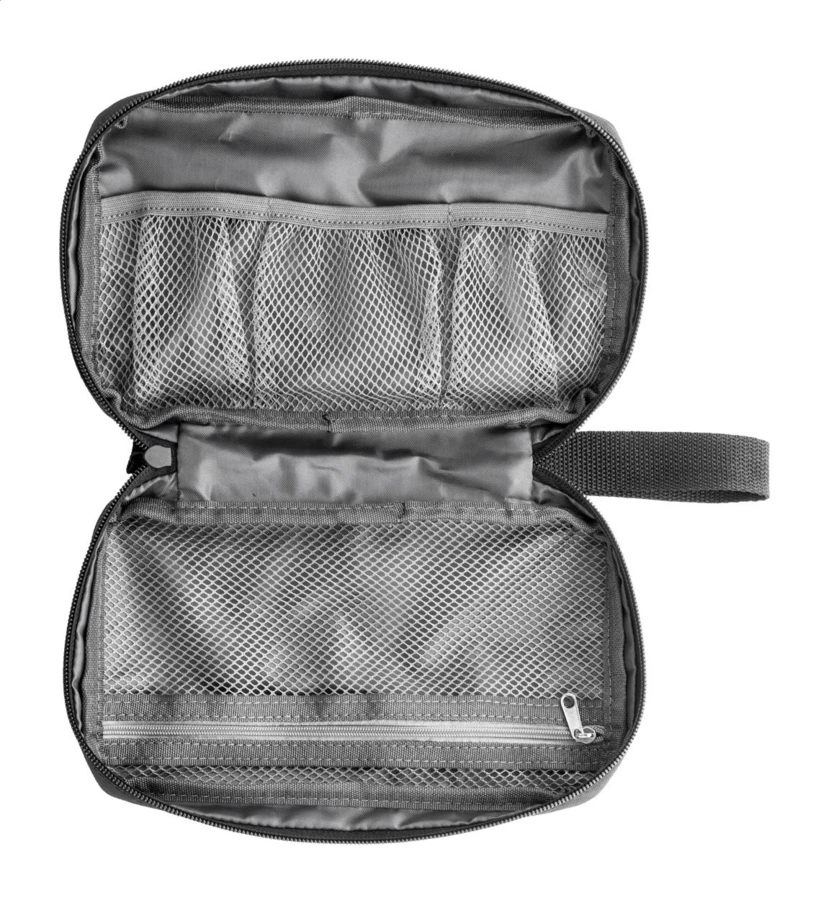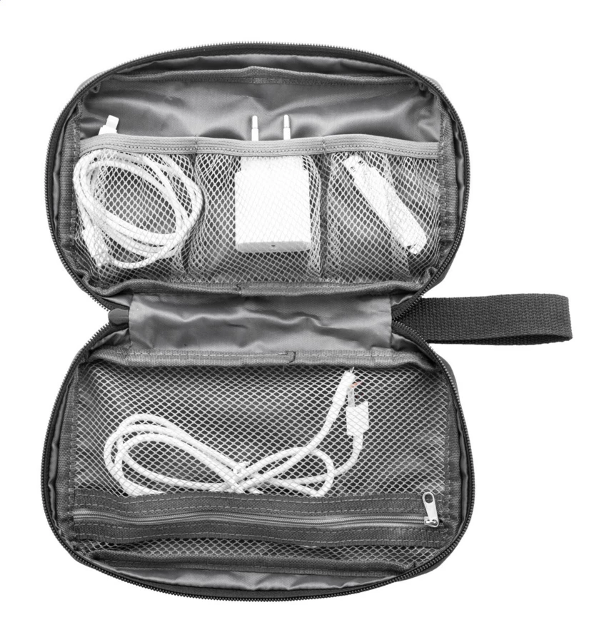 Zamykany na suwak organizer do kabli RPET z przegródkami z siateczki i kieszenią z przodu zapinaną na suwak. Poliester RPET 600D z charakterystyczną metką RPET.