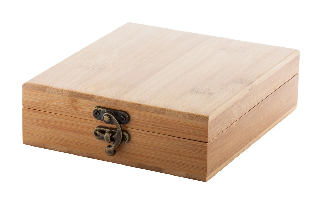 Zestaw do wina z 4 akcesoriami z drewna inkrustowanego w bambusowym pudełku.