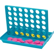 Gra dla dwóch osób `4 in a row` z żółtymi i różowymi pionkami oraz składaną planszą. Całość wykonana z plastiku.