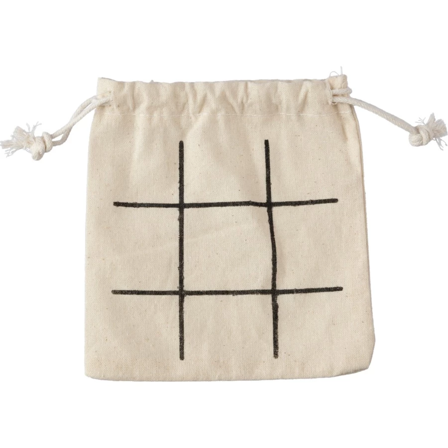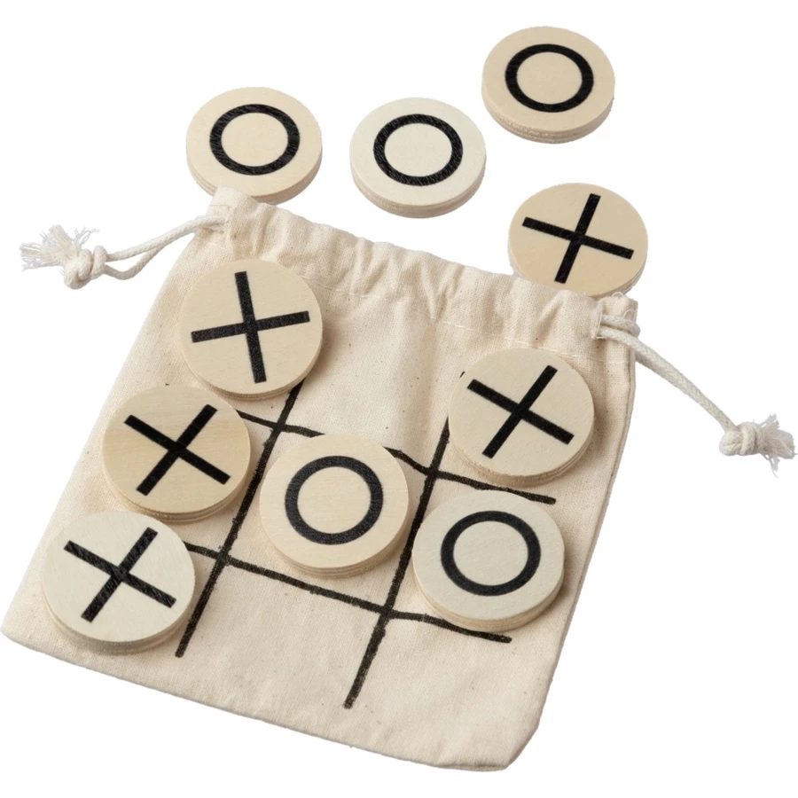 Gra "kółko i krzyżyk", zawiera 10 małych drewnianych żetonów zapakowanych w bawełniany woreczek, produkt wykonany z drewna