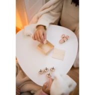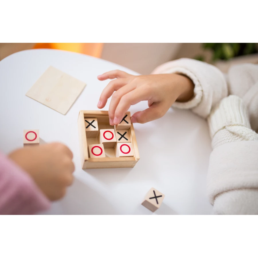 Gra "kółko i krzyżyk" w pudełku, zawiera 9 klocków z symbolami kółek i krzyżyków, może być ciekawym sposobem na ćwiczenie strategii i logicznego myślenia, produkt wykonany z drewna