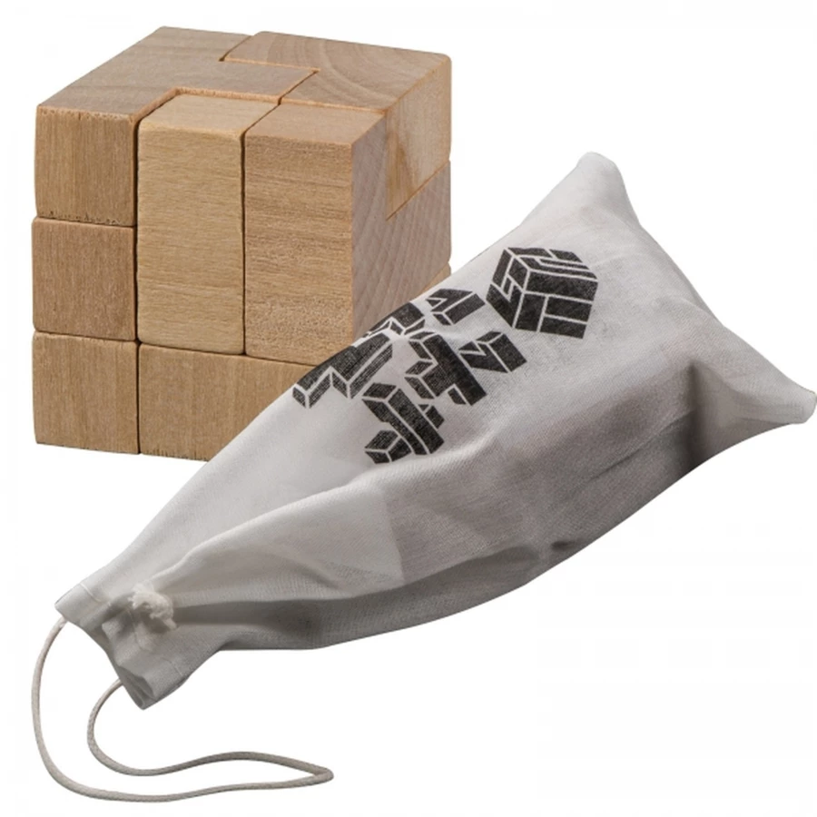 Gra logiczna wykonana z drewna w bawełnianym woreczku.