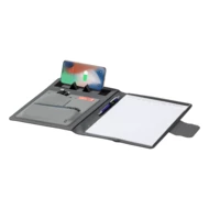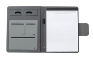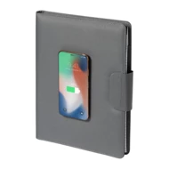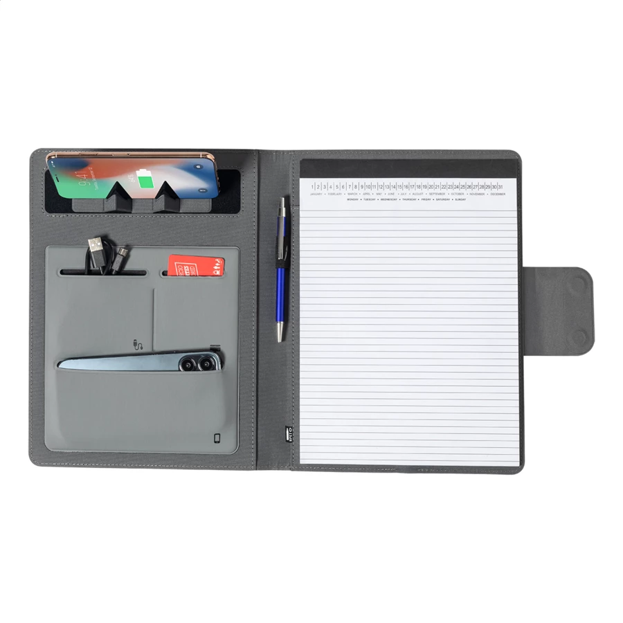 Teczka na dokumenty w formacie A4 wykonana z poliestru 300D RPET z wbudowaną magnetyczną szybką ładowarką indukcyjną (10 W), power bankiem 5000 mAh z portem ładowania USB, składanym uchwytem na telefon komórkowy i notatnikiem na 20 kartek w linie. W zestawie samoprzylepny metalowy pierścień do korzystania z funkcji magnetycznej na dowolnym urządzeniu ładowanym bezprzewodowo. W zestawie kabel do ładowarki USB.