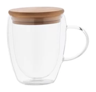 Kubek termiczny z podwójnymi ściankami ze szkła borokrzemowego z uchwytem i bambusową pokrywką, 350 ml. W kartoniku.
