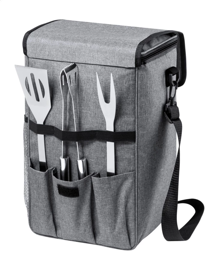 Torba termoizolacyjna RPET z wyściółką PEVA, przegrodą zapinaną na zamek i regulowanym paskiem na ramię. Zawiera 3-częściowy zestaw do grillowania ze stali nierdzewnej (widelec, łopata i szczypce). Poliester 600D RPET z charakterystyczną metką RPET.
