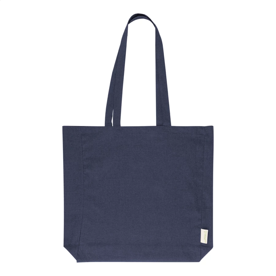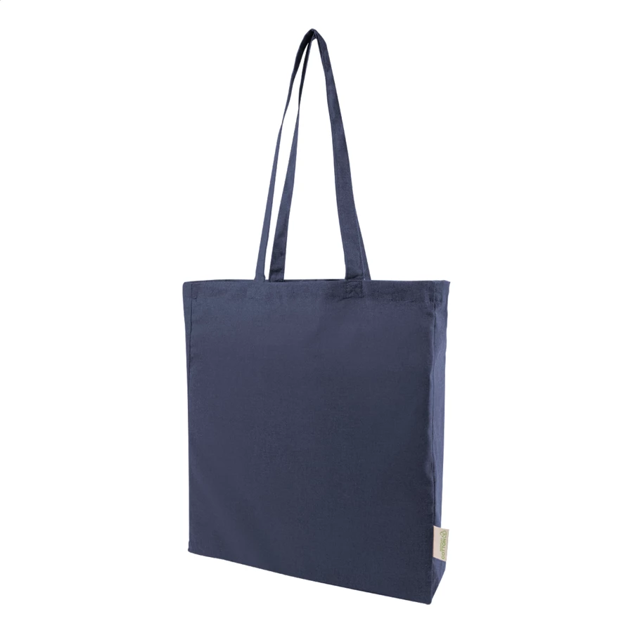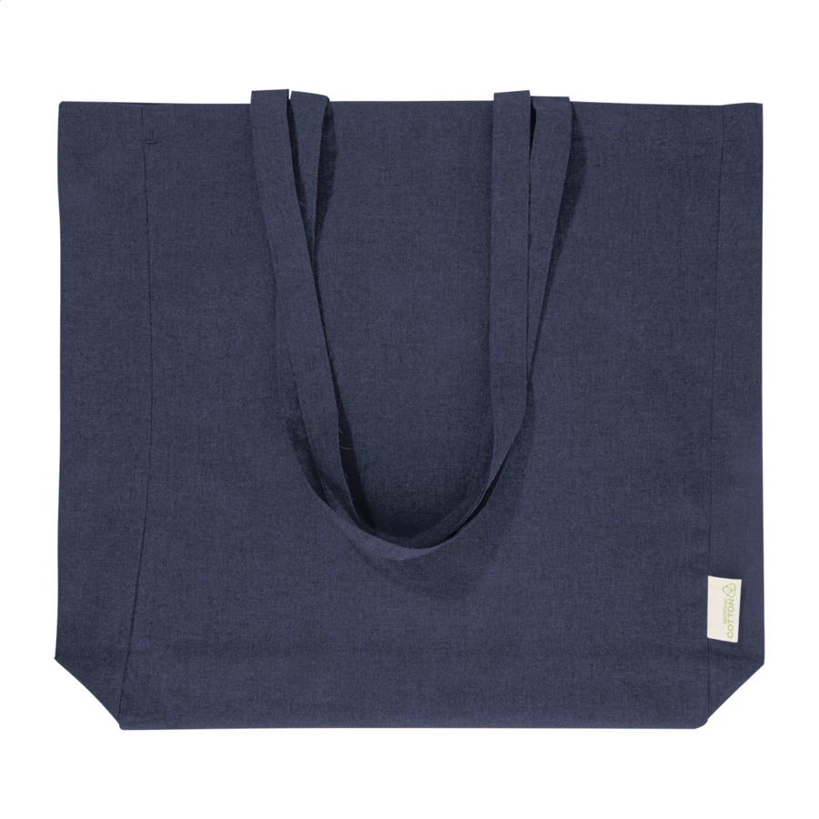 Torba na zakupy z klinem i długimi uchwytami, wykonana w 70% z bawełny z recyklingu i w 30% z poliestru RPET, o gramaturze 140 g/m². Z charakterystyczną metką z bawełny z recyklingu.