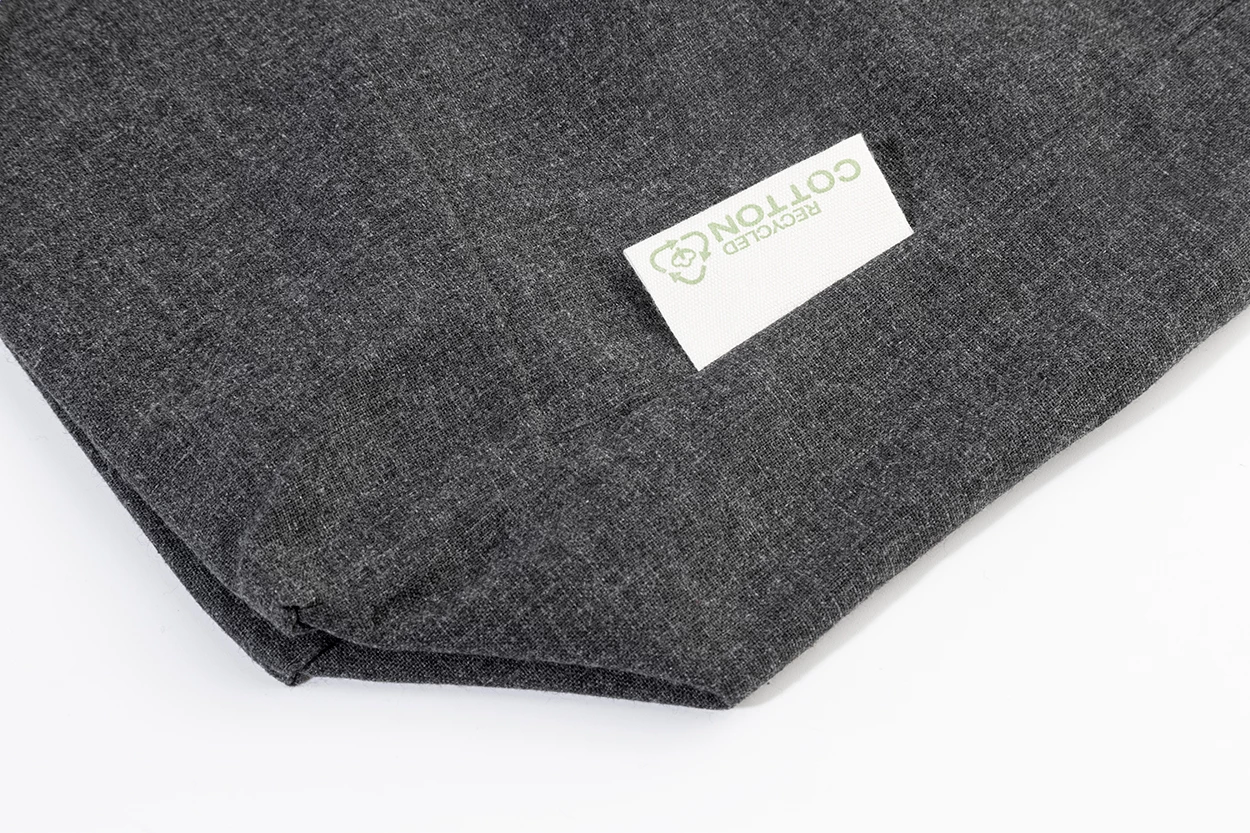 Torba na zakupy z klinem i długimi uchwytami, wykonana w 70% z bawełny z recyklingu i w 30% z poliestru RPET, o gramaturze 140 g/m². Z charakterystyczną metką z bawełny z recyklingu.