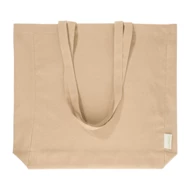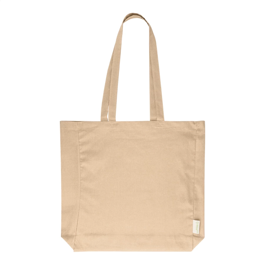 Torba na zakupy z klinem i długimi uchwytami, wykonana w 70% z bawełny z recyklingu i w 30% z poliestru RPET, o gramaturze 140 g/m². Z charakterystyczną metką z bawełny z recyklingu.