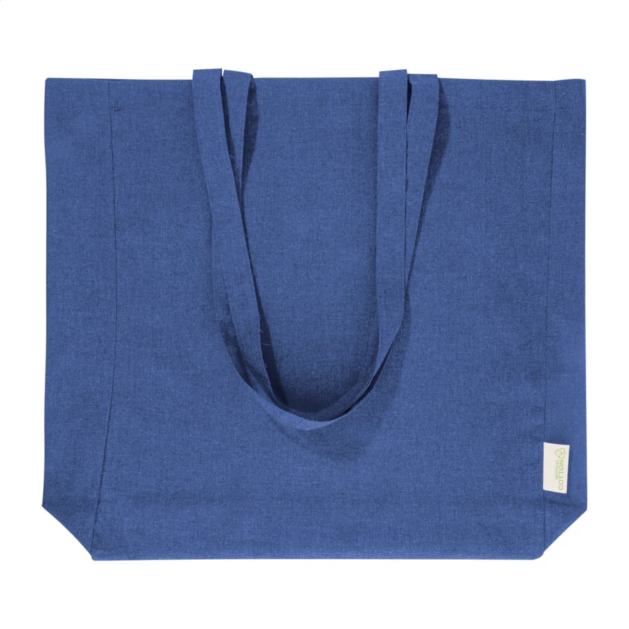 Torba na zakupy z klinem i długimi uchwytami, wykonana w 70% z bawełny z recyklingu i w 30% z poliestru RPET, o gramaturze 140 g/m². Z charakterystyczną metką z bawełny z recyklingu.