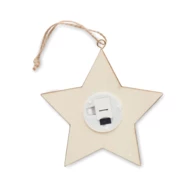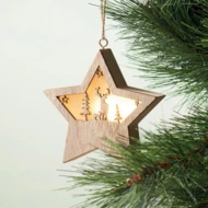 Gwiazda z płyty MDF z lampką w środku, z ozdobami świątecznymi i sznurkiem do zawieszania. Zawiera 3 baterie LR44.