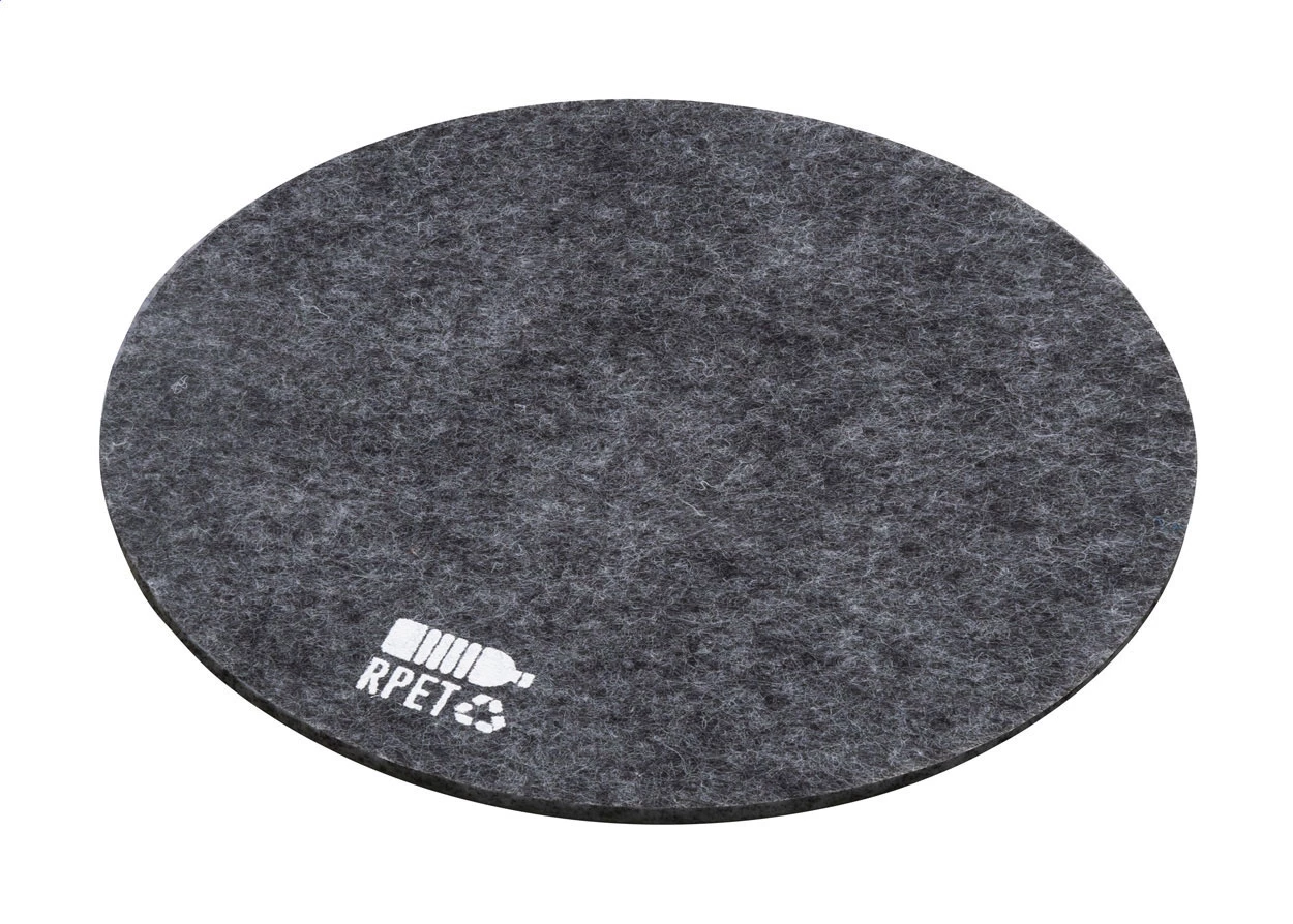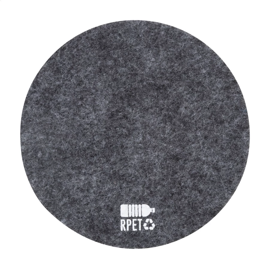 Okrągła podkładka z filcu RPET. Z charakterystyczną metką RPET.