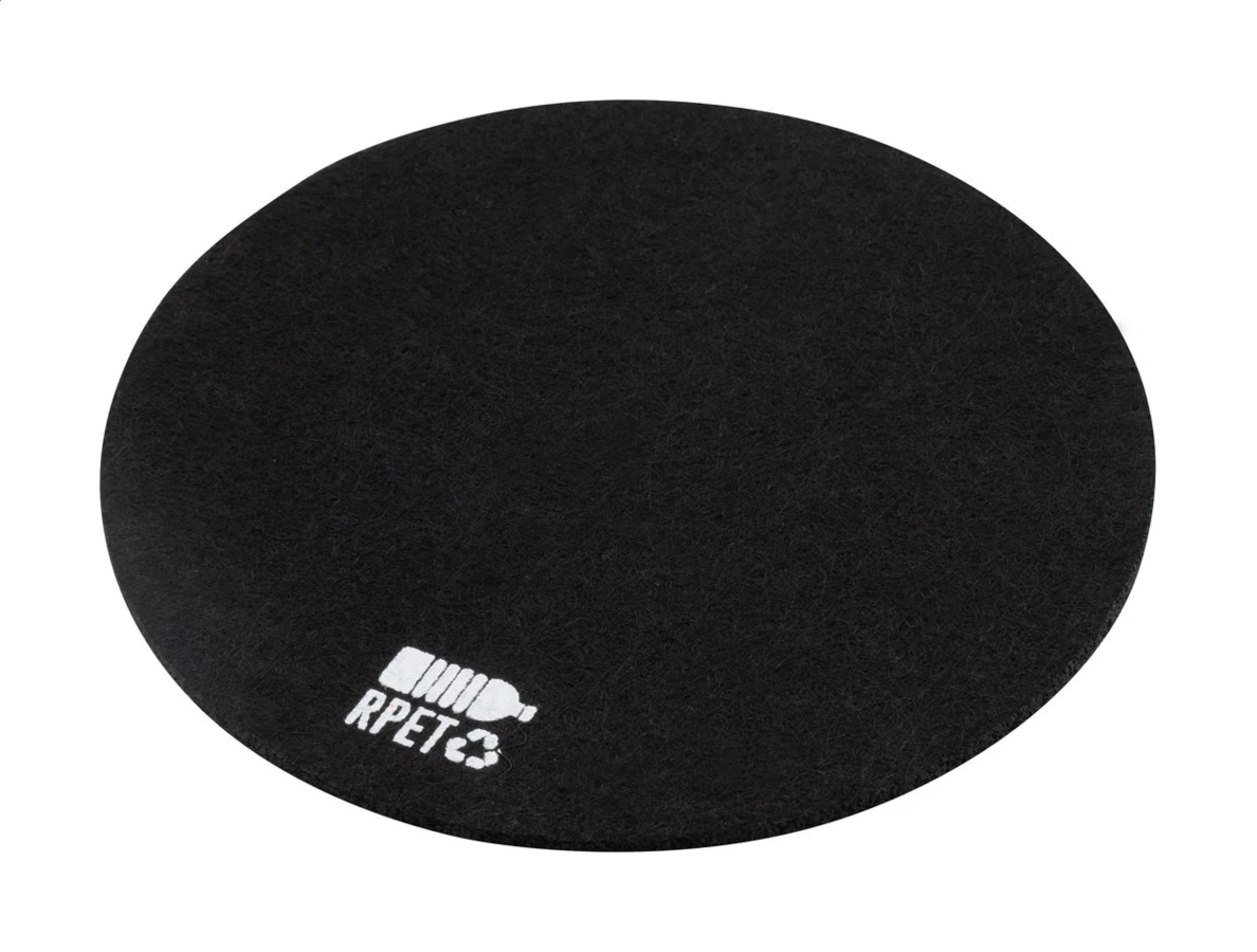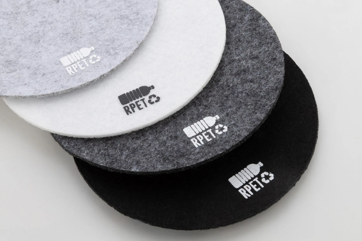 Okrągła podkładka z filcu RPET. Z charakterystyczną metką RPET.