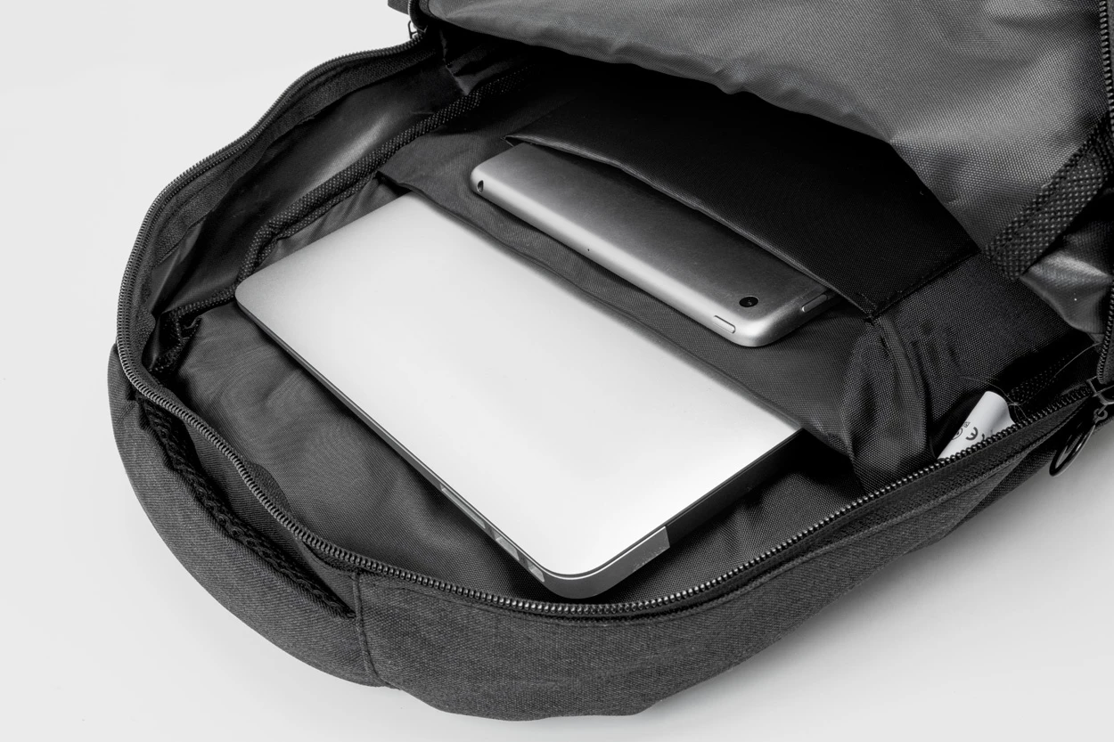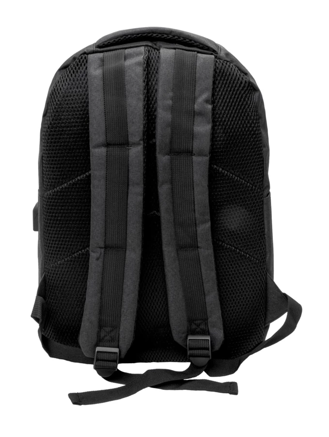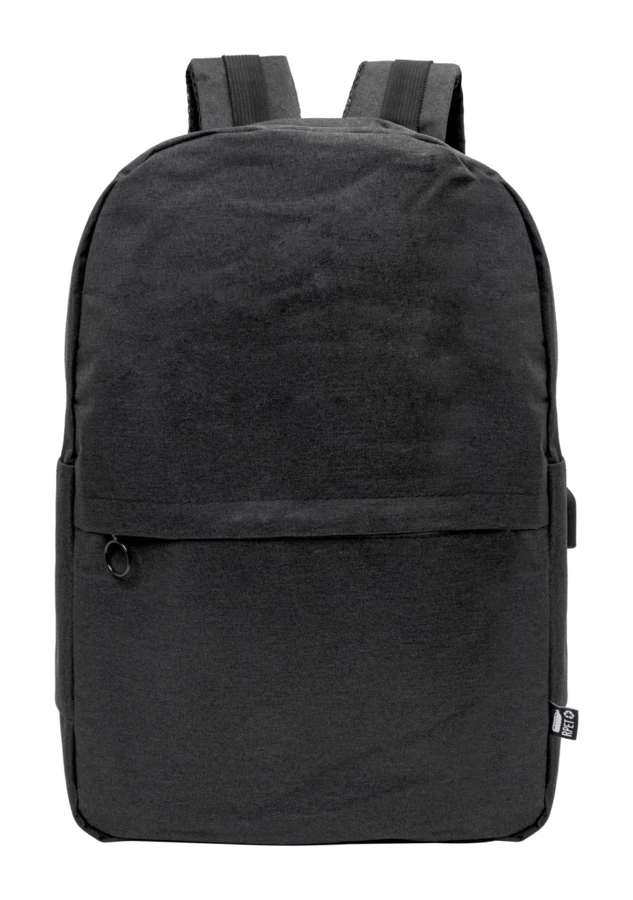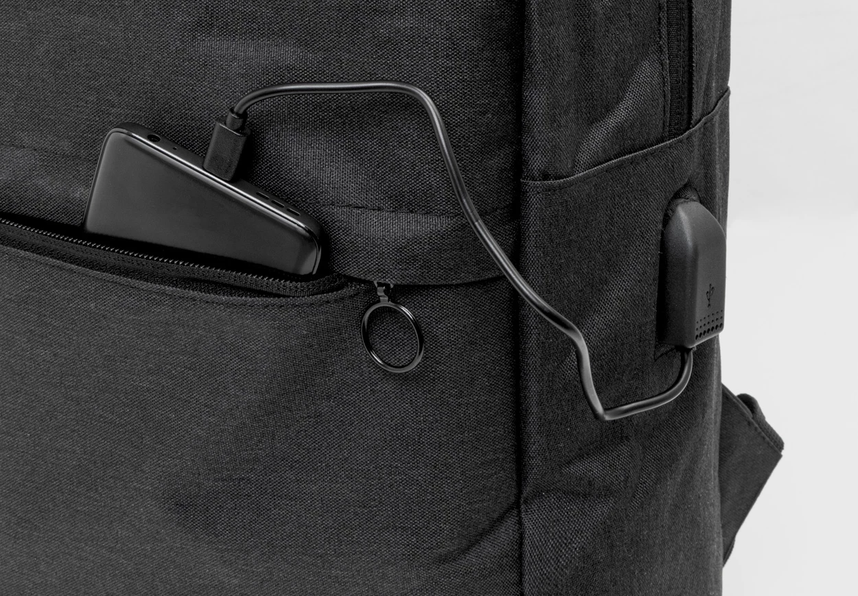 Plecak z zapinanymi przegrodami, wyściełaną przegrodą na laptopa (15 ”) i miejscem na tablet (10”), wyściełanym tyłem i paskami na ramię. Z wbudowanym gniazdem USB do power banka. Poliester 600D RPET. Z metką RPET.