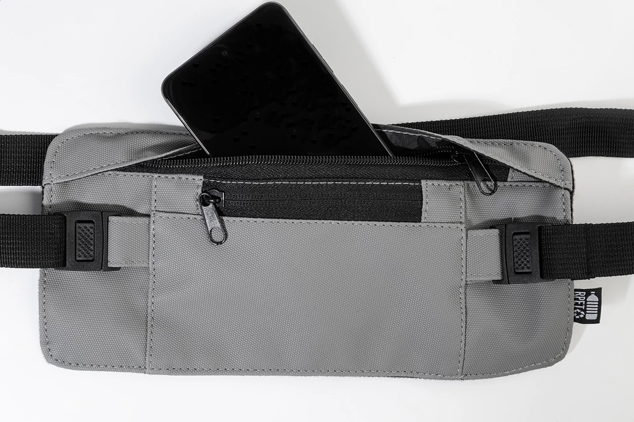 Smukła torba biodrowa z RPET z powłoką PU na przedniej stronie, przegrodą na zamek błyskawiczny, kieszenią z przodu i regulowanym paskiem. Wykonana z poliestru 600D RPET z powłoką PU, z charakterystyczną metką RPET.