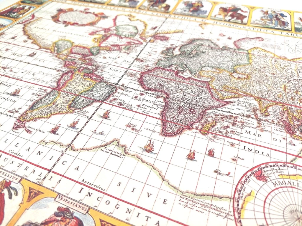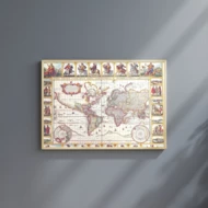 Reprint historycznej mapy świata N. I. Piscatora z 1652 roku to bogato zdobiona dekoracja, która wniesie do mieszkania ducha odkrywców. Mapa Nova Totius Terrarum Orbis Geographica Ac Hydrographica Tabula to XVII-wieczna, coraz dokładniejsza wizja naszego świata. Mapa ta, ze względu na dekoracyjną obramówkę przedstawiającą rzymskich cesarzy, nazywana jest Mapą Dwunastu Cesarzy.