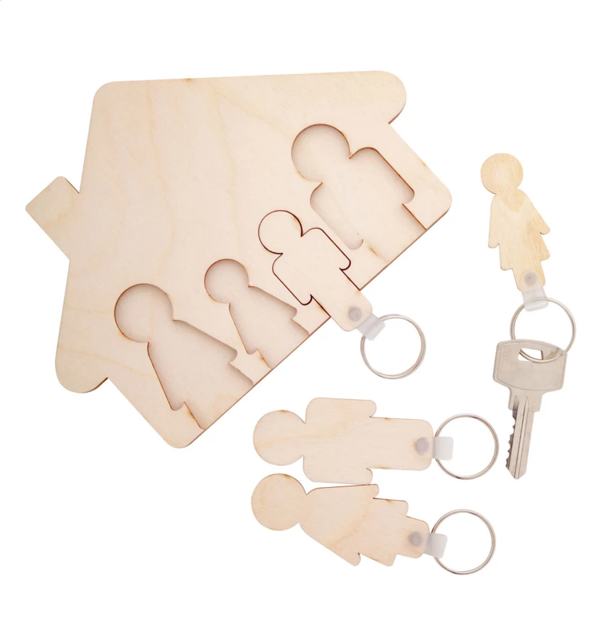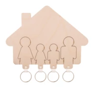 Ścienny uchwyt na klucze w kształcie domu z 4 wyjmowanymi breloczkami w rodzinnym stylu. Wykonany ze sklejki brzozowej.