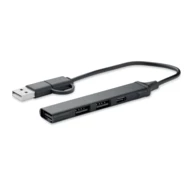 4-portowy hub USB z aluminium pochodzącego z recyklingu. 3 USB-A + 1 Type-C. Wejście: 2 w 1 Type-C i Type-A. Długość kabla: 19 cm.