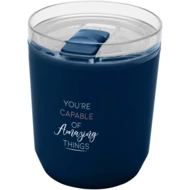 Kubek o prostym designie, pasujący do większości ekspresów do kawy i uchwytów samochodowych. Ma konstrukcję z podwójnymi ściankami, zewnętrzną powłokę z polipropylenu z recyklingu i wewnętrzną z polipropylenu. Przesuwana pokrywka jest wykonana z tworzywa sztucznego AS i polipropylenu. Pojemność: 180 ml.