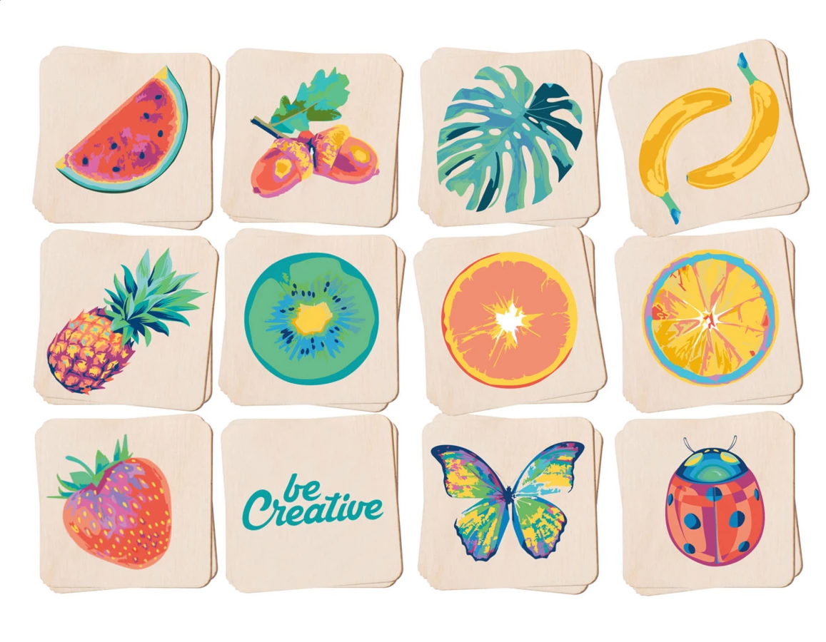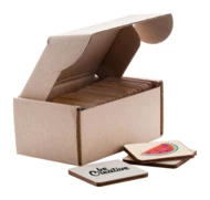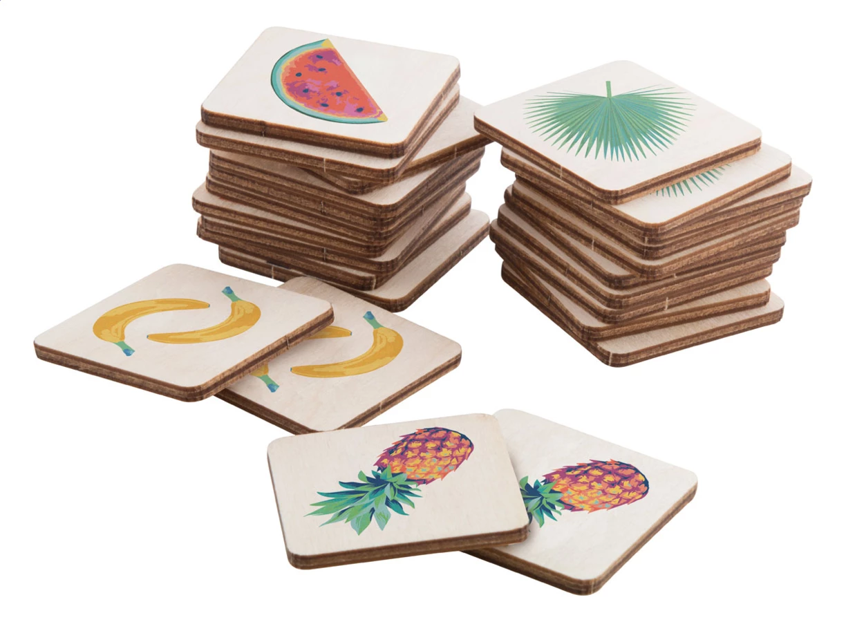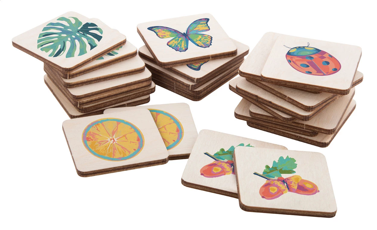 Laminowana gra memory ze sklejki brzozowej z własną grafiką. Z 24 płytkami (40x40 mm). Cena obejmuje 12 różnych nadruków w full kolorze na przedniej stronie płytek i identyczny nadruk w full kolorze na tylnej stronie wszystkich płytek. Min. ilość: 250 szt.