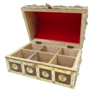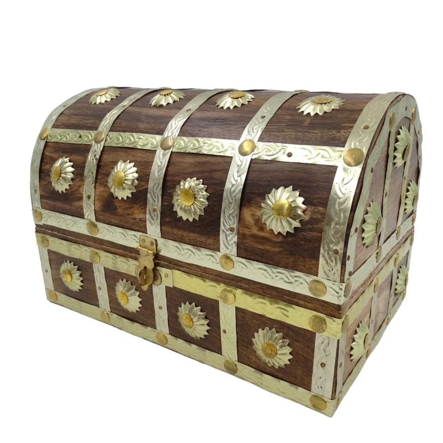 Inksrustowana skrzyneczka drewniana ułatwia przechowywanie domowych skarbów. Pudełko pomieści drobną biżuterię, klucze i listy. Można ją wypełnić monetami przeobrażając ją w zaginioną skrzynię skarbów.