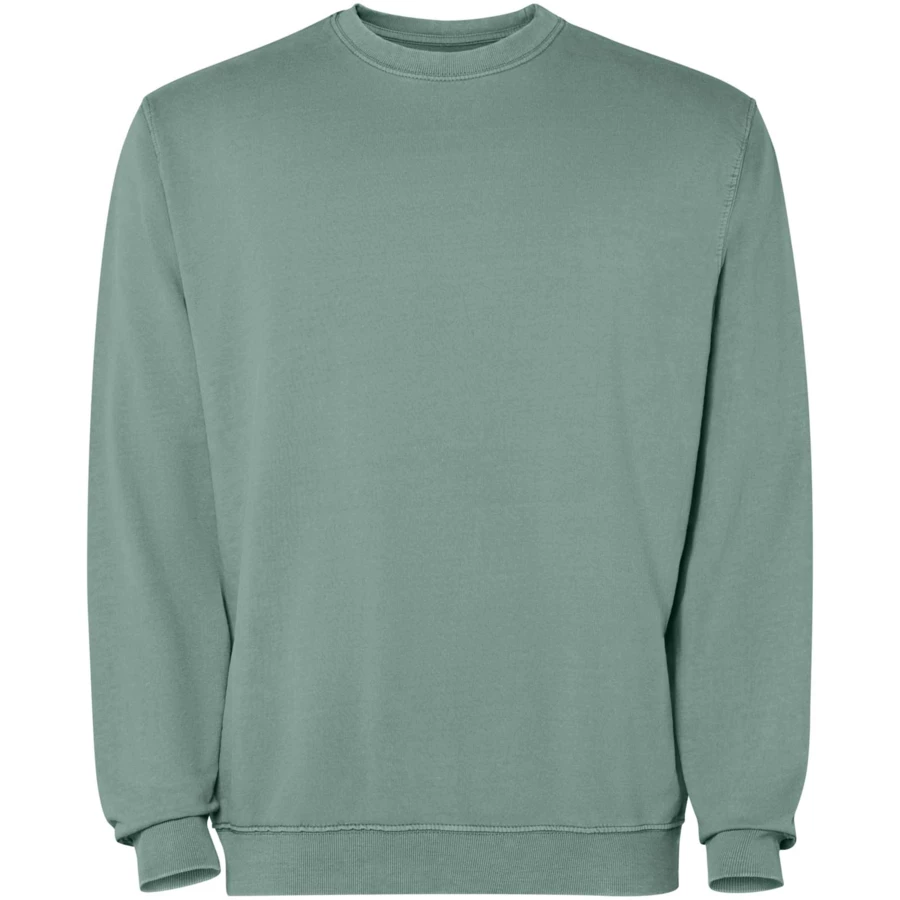 Sweter unisex z wykończeniem uzyskanym dzięki poddaniu działaniu wybielacza w celu uzyskania smug lub odbarwień. Prążkowany ściągacz 2x1 przy dekolcie, mankiety i dół w tym samym kolorze. Wzmocnione szwy przy mankietach, u dołu, w pasie i otworach na ręce. Ścieg kryty ton w ton przy dekolcie.