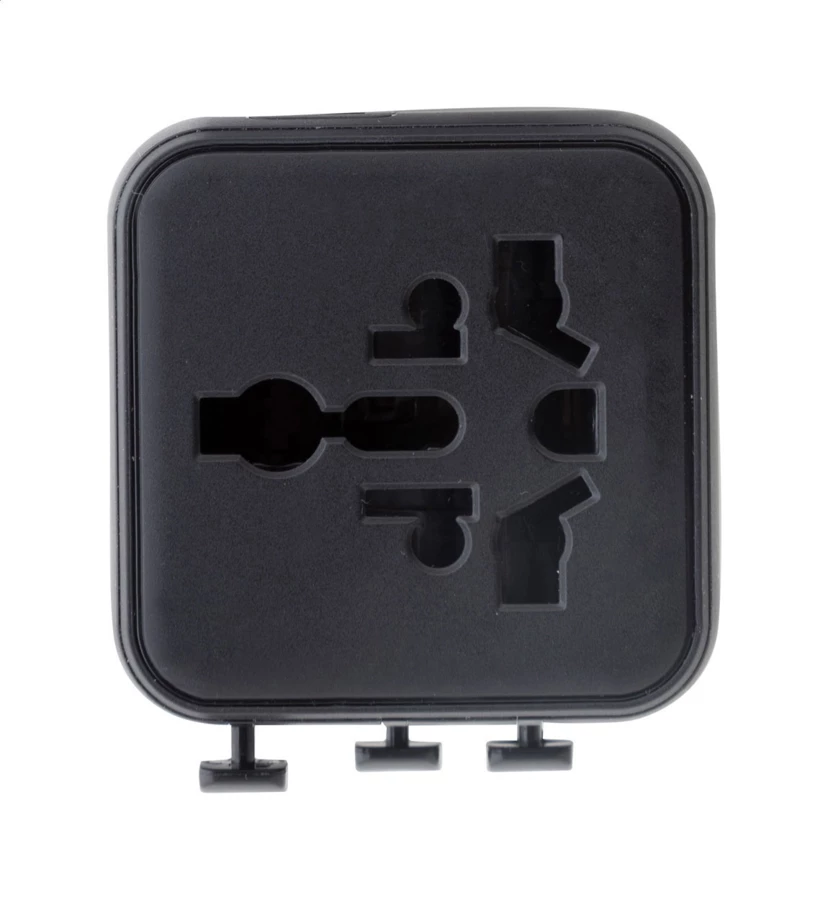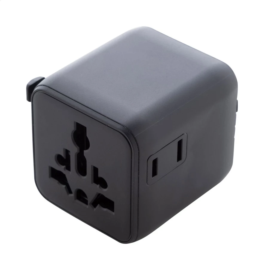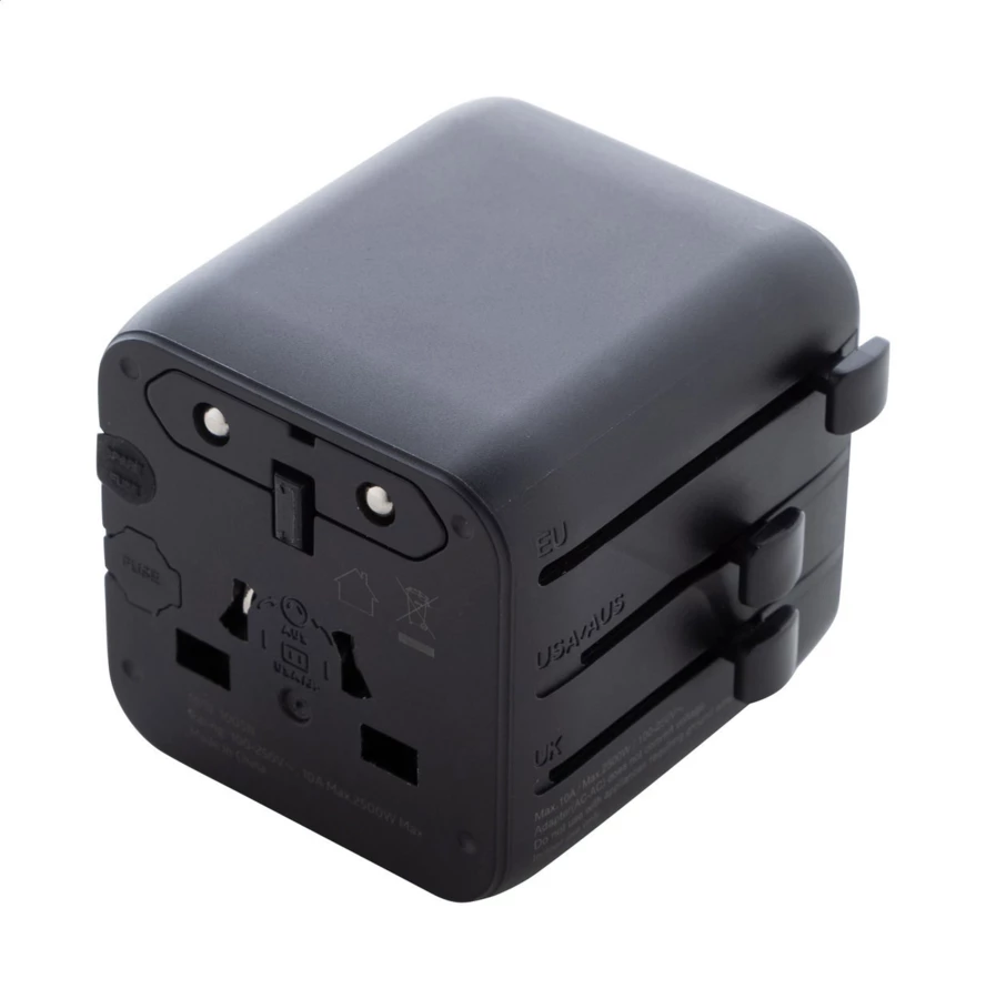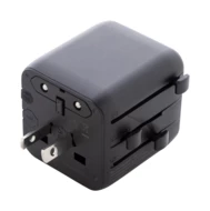 Ultrakompaktowy, uniwersalny adapter podróżny wykonany z przetworzonego plastiku PC, z wbudowanymi końcówkami do gniazdek w USA, Europie, Wielkiej Brytanii i Australii.